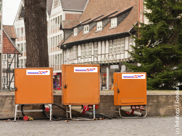 Wir vermieten Anschluss-Schränke, Baustromverteiler, Gummikabel, Kabelbrücken zur Straßenüberquerung und vieles mehr.